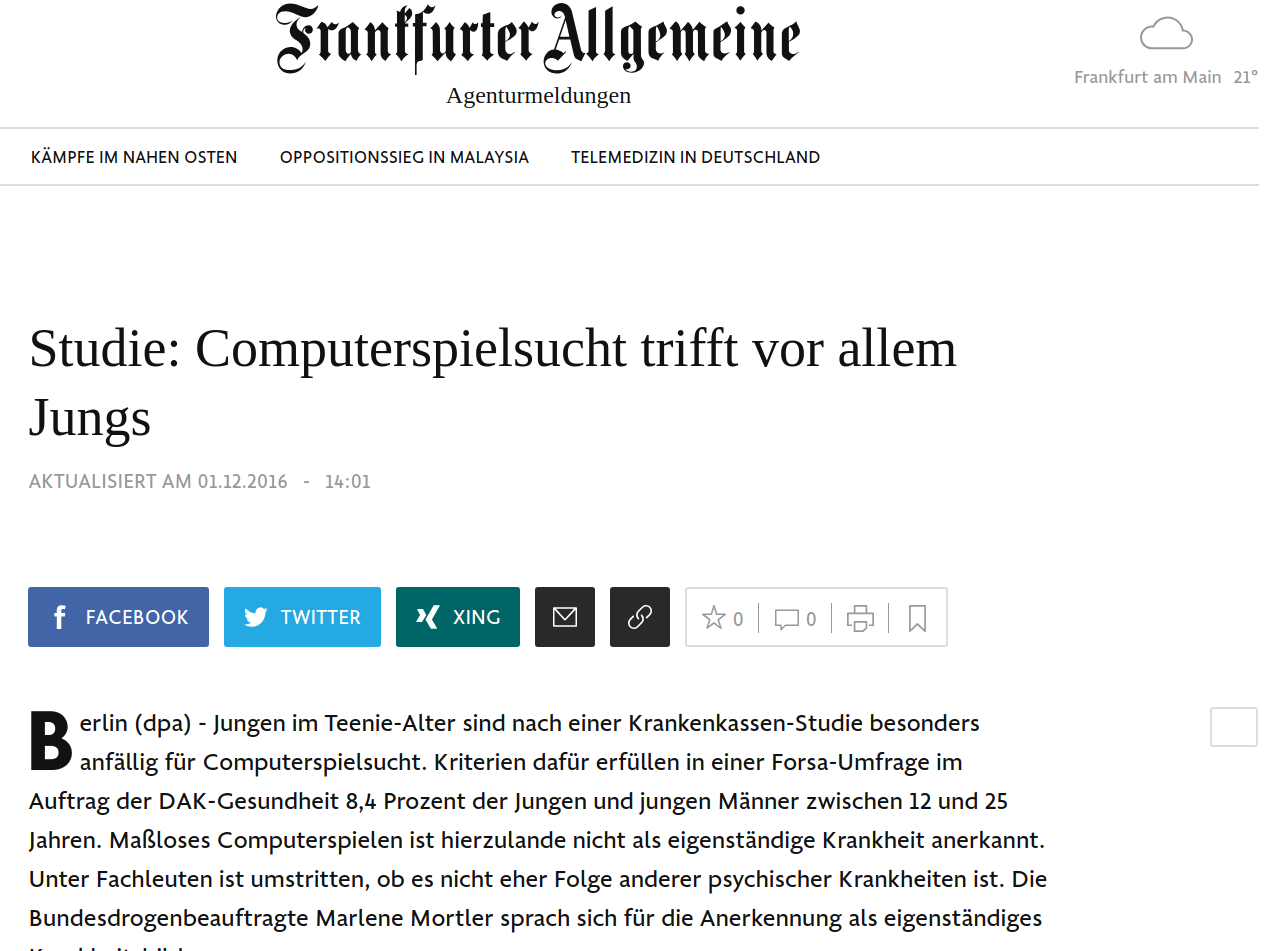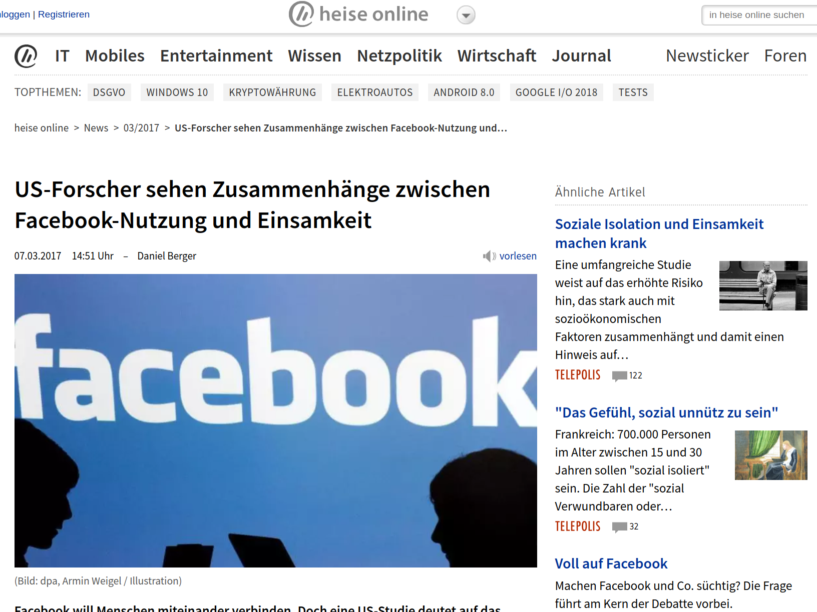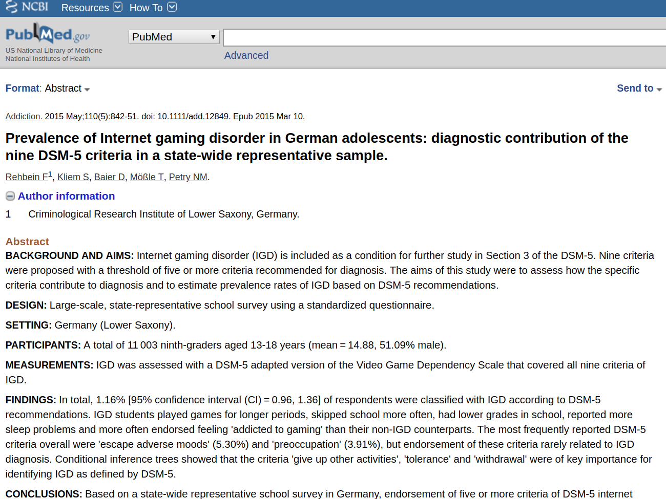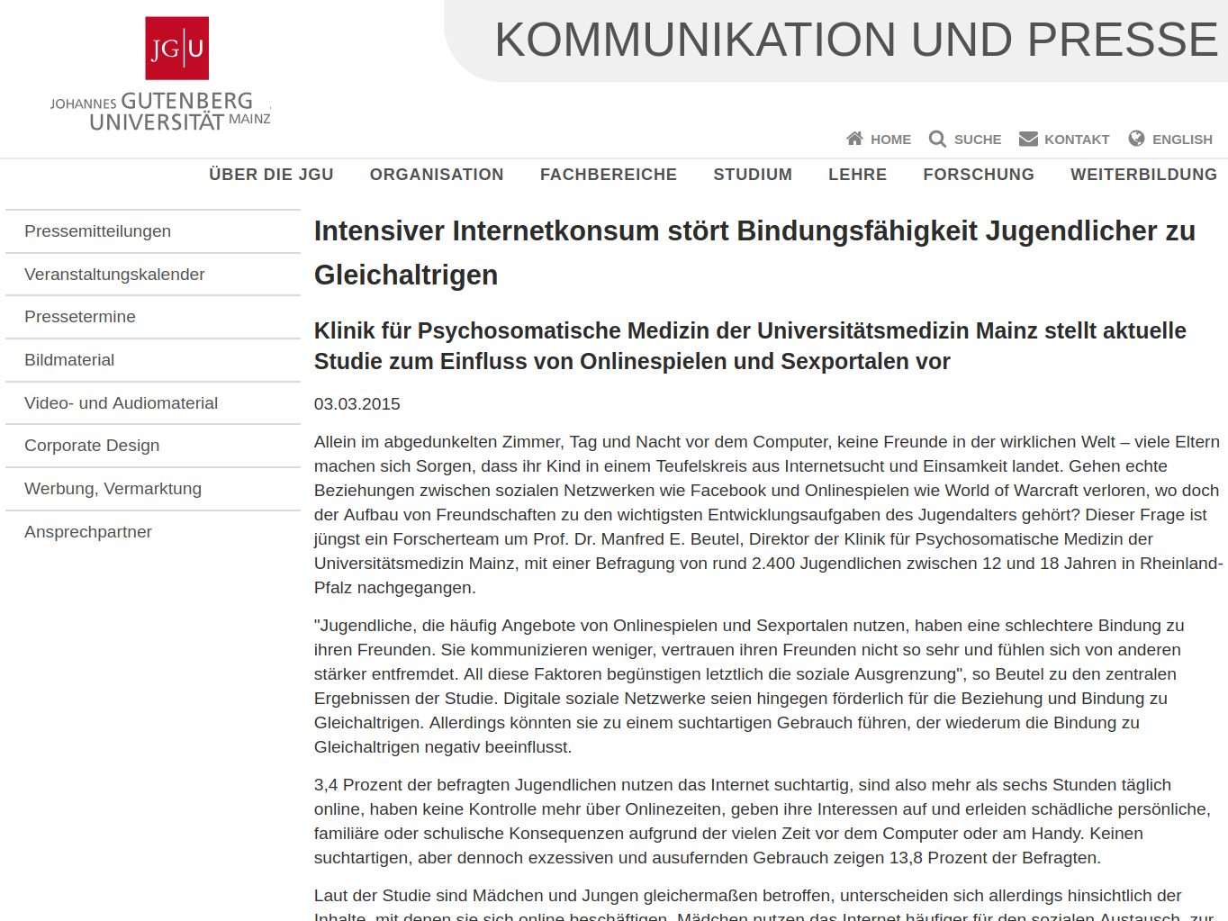 Die Analyse ist nicht die erste, die negative Folgen des Internets feststellt. So ergab 2015 eine Befragung der Klinik und Poliklinik für Psychosomatische Medizin und Psychotherapie Mainz, dass Jugendliche, die häufig online spielen oder auf Sexseiten surfen, eine schlechtere Bindung zu ihren Freunden haben, weniger kommunizieren und sich eher entfremdet fühlen.