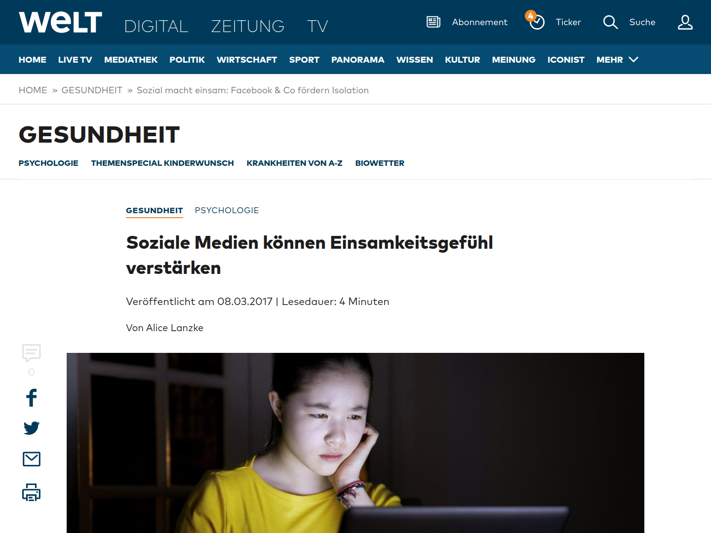 Es könne aber auch sein, dass intensivere Nutzung zu einem Gefühl der Isoliertheit von der echten Welt führe oder aber eine Kombination von beidem vorliege. „Doch selbst, wenn die Einsamkeit zuerst da war, scheint sie nicht durch soziale Netzwerke abgemildert zu werden“, betont die Kinderärztin.